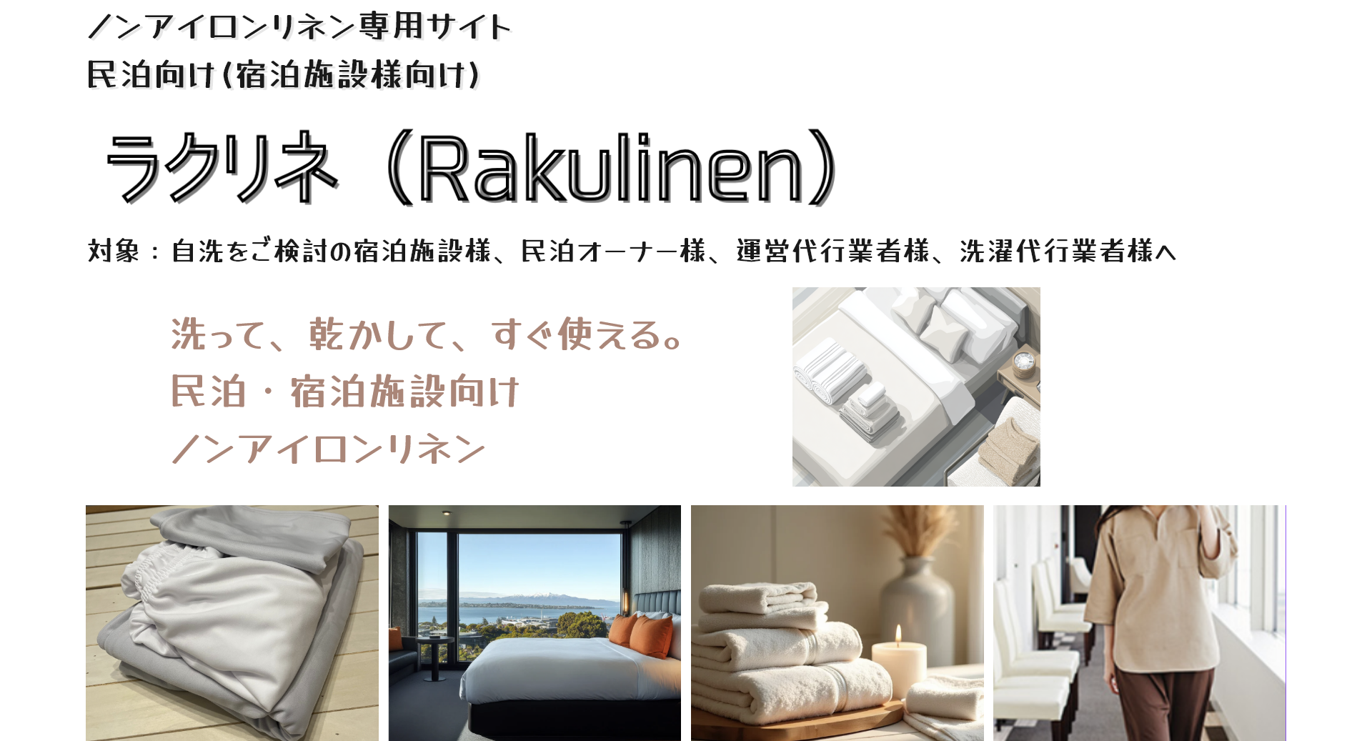 ラクリネは、民泊・ホテル・宿泊施設の自洗運営を前提に開発されたノンアイロン業務用リネンブランドです。