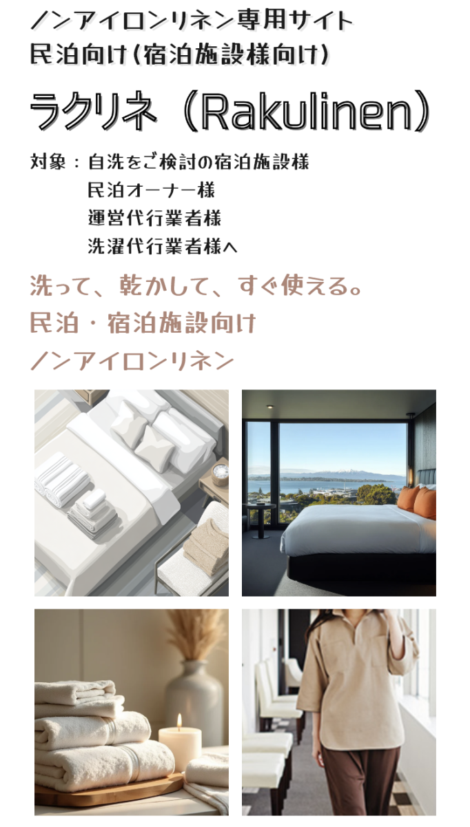 などのキーワードで検索されることが多く、民泊・ホテルの自洗リネン運用に関する情報を探す海外オーナーや運営会社からも関心が高まっています。